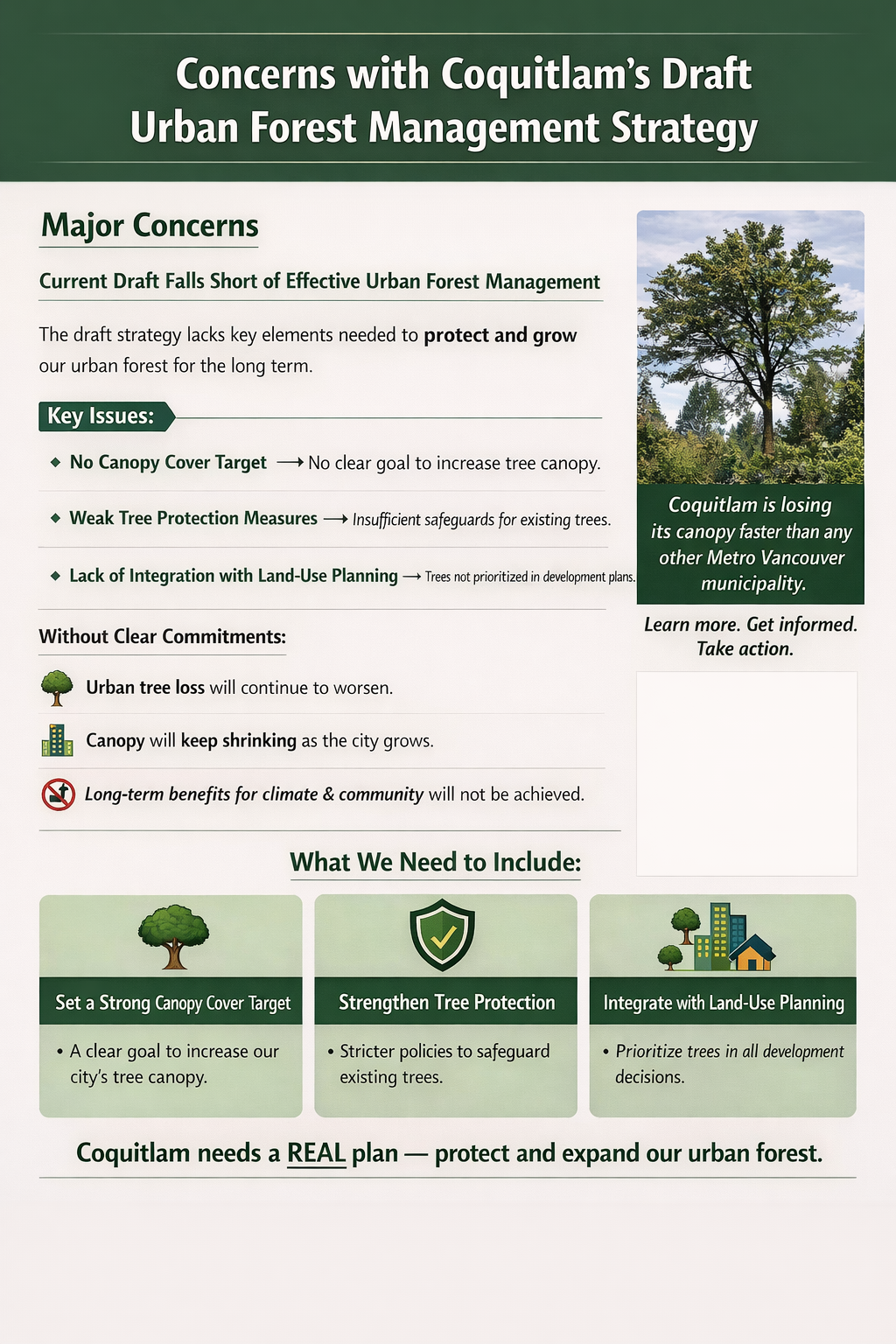 Many residents and environmental groups are concerned that the current draft focuses too heavily on tree planting, without the stronger protections needed to prevent the ongoing loss of mature trees.